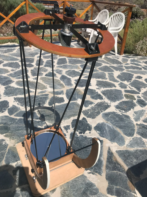 On arrival at La Reine Sofia airport, we had the usual problems of finding outsize baggage and the relatively common problem for this trip as discovered by this team , of missing or delayed baggage. My complement of equipment consisted of the 12" f/4 low-rider dobsonian for deep visual, of which more later; an Askar 120 refractor with its focal reducer for deep sky narrow field, and a Skywatcher Star Adventurer Mini (SAM) carrying my de-filtered Nikon DSLR attached to an Askar 180mm f/4 lens or a Nikon 28-80 as a multi-purpose wide-field camera with option for use as a finder scope, camera lens or even Quark-attached solar scope. The final component was a pair of 10x42 travel binos for actually doing some widefield visual observing. My planning was all about setting up the scopes to image on automatic and give me some time to do some visual astronomy with both the binos and the dob. The dob had been an urgent project to get ready in time to take way for the trip. Who carries a 12" dob on an airplane ? Well, nowadays I do: see the low-rider page